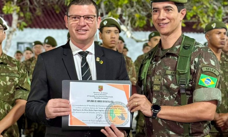O vereador Dinho Papa-léguas foi homenageado pelo 31º Batalhão de Infantaria Motorizado do Exército Brasileiro, em Campina Grande, com a honraria de Amigo do Batalhão. A condecoração foi entregue pelo comandante da unidade, Tenente-Coronel Campos, em reconhecimento ao apoio e à parceria do parlamentar junto à instituição.